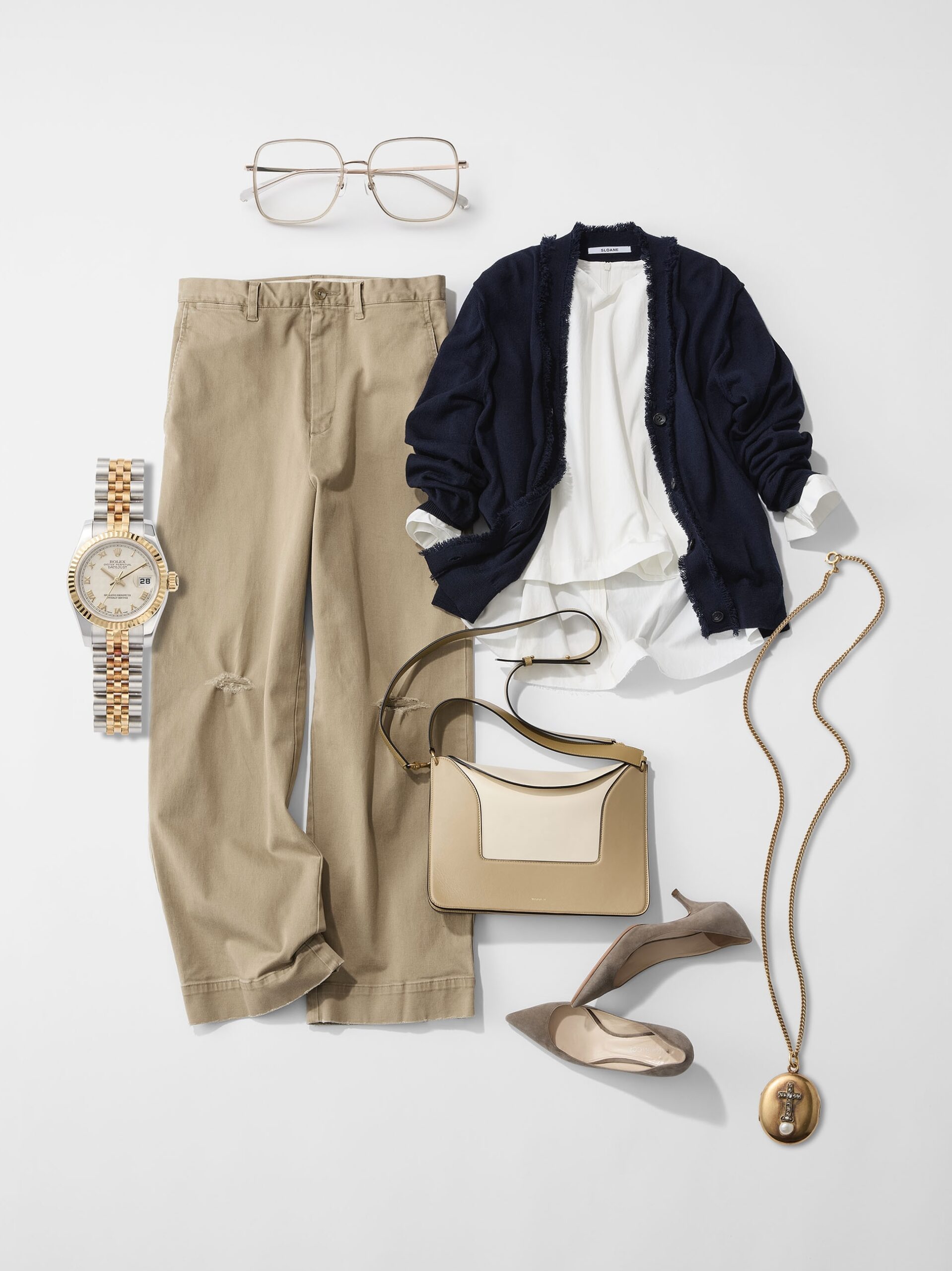 「ネイビーのVネックカーディガンにチノパンというトラッドな組み合わせ。インナーを、Tシャツではなく、白のボックスブラウスにすることで、新鮮かつ大人の印象に。袖や裾──特に後ろからのぞく白が、後ろ姿に表情を生み、奥行きを出してくれます。バッグや靴、時計やネックレスは、ベージュ〜ゴールドを基調にまとめ、メンズライクになりがちなトラッドをレディにクラスアップ」
