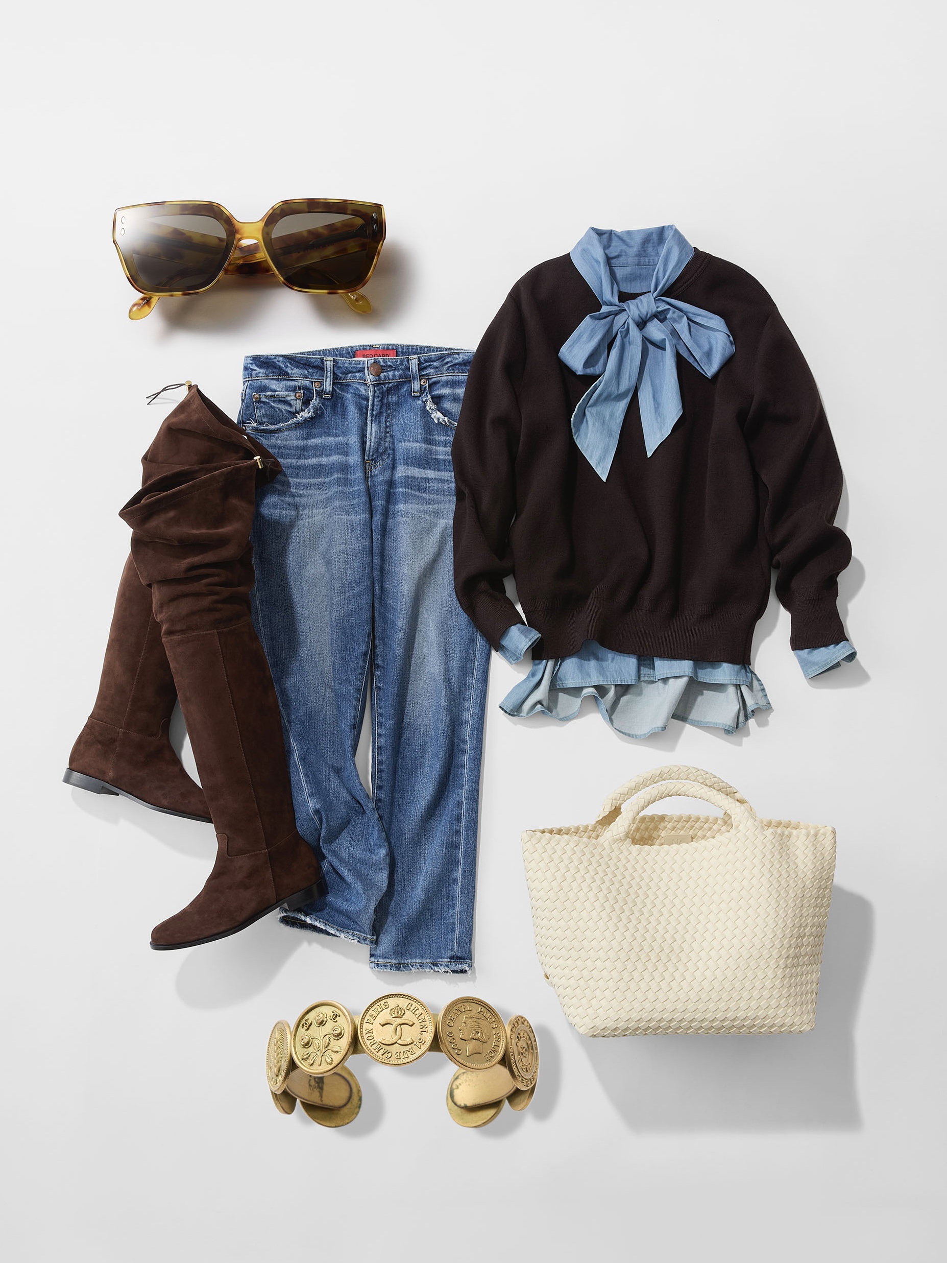 「旬のチョコレートブラウンを主役にしたスタイリング。ベーシックカラーとは一味違う深みが、いつものデニムスタイルをアップデートしてくれます。合わせたバッグは、生成りのような温度感のある白。こっくりしたチョコレートブラウンと合わせても浮くことなく、むしろ、馴染みながら、ヘルシーな軽やかさをプラスしてくれます。サングラスとバングルは、あえてボリューミーなものを選び、着こなしに”強さ”を添えるスパイスに」