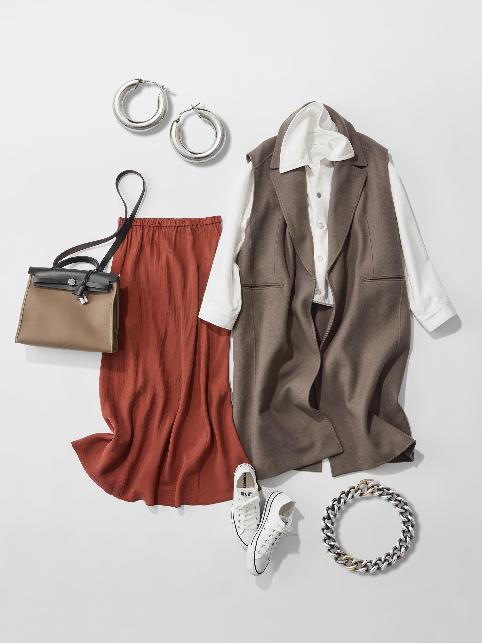 「ジレの下に着るアイテム=ニットやシャツ、カットソーと思いがちですが、デニムジャケットをシャツ感覚で仕込んであげると、冬でもジレが楽しめ、着こなしの幅がぐっと広がります。カジュアルな白のデニムだから、レイヤードしても重たくならないのもポイント。足元はスニーカーでカジュアルダウン。ほどよく力が抜け、そして白が散ることでリズミカルな仕上がりに。くすみオレンジのスカートで、温度感と動きを添えて」