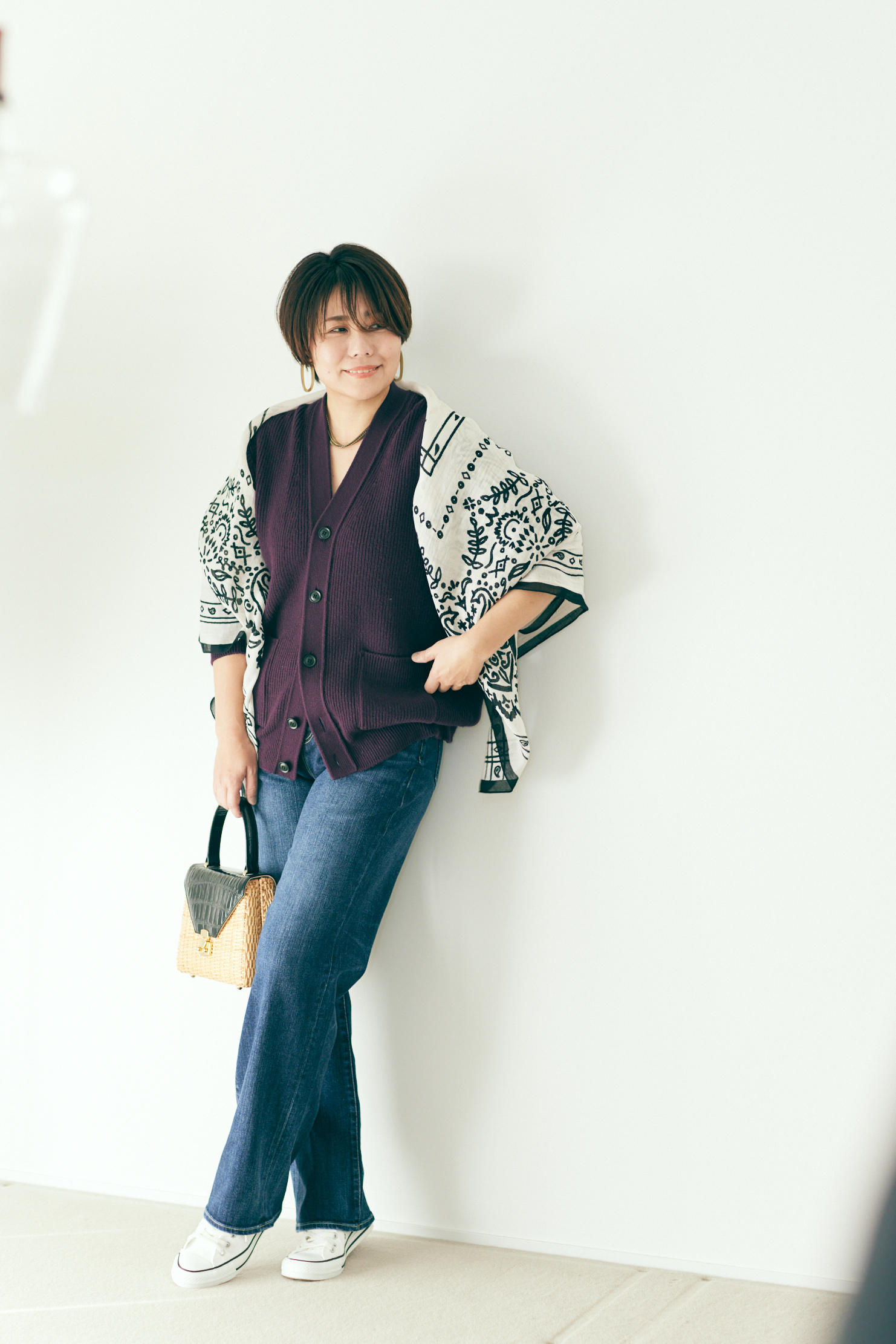 「プラムカラーのカーディガンにデニムを合わせた、いわゆるワン・ツーのベーシックスタイル。そこに、ストールを三角に折って肩を落とすように巻くことで、着こなしにさりげないニュアンスを加えました。さらに、ストールとスニーカーの色をリンクさせることで、白の分量は控えめでも、装い全体にリズムが生まれます。服だけで完結させず、小物で白を散らす──そんなひと工夫が、シンプルになりがちな冬のスタイリングを軽やかに更新してくれます」