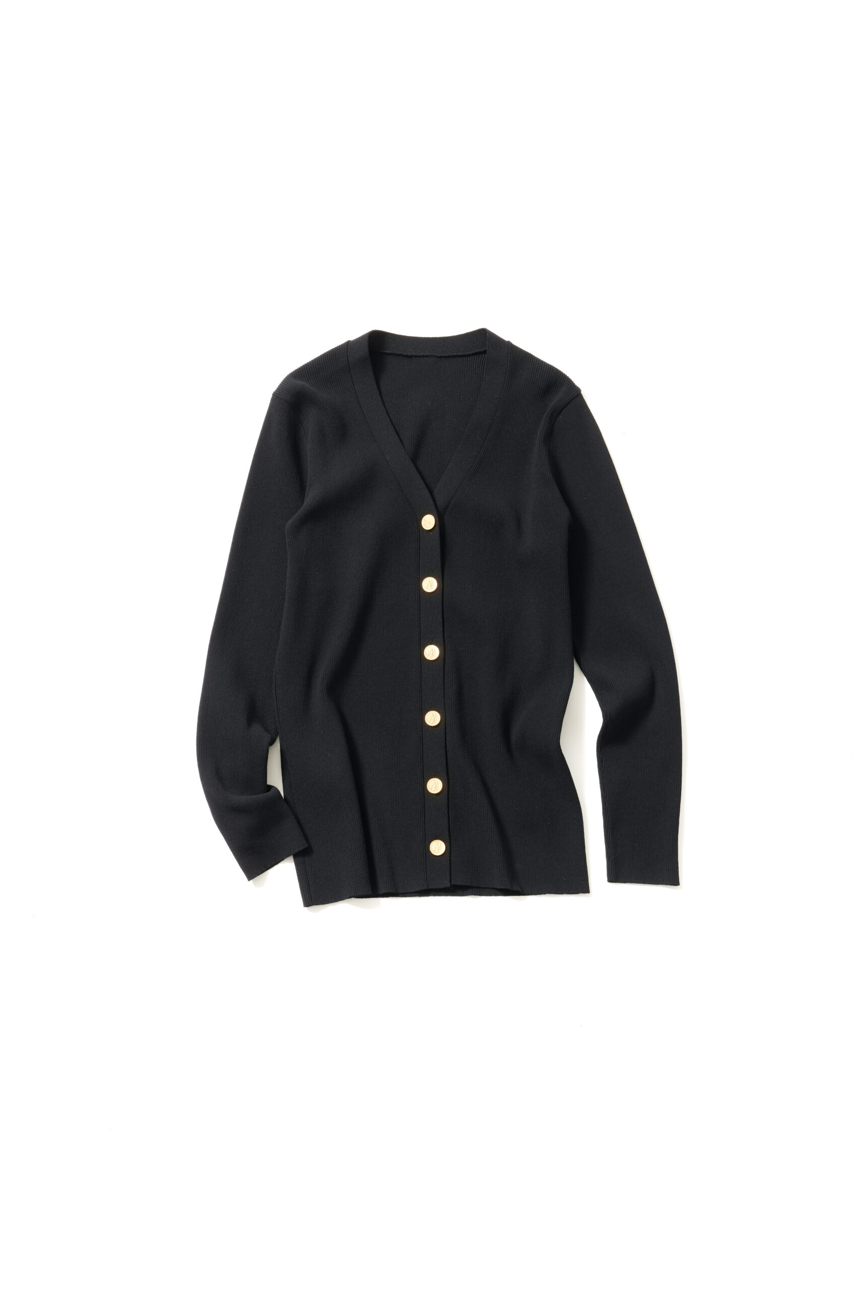 ドゥーズィエム クラスの定番として大人気のニットアップ、DINERシリーズのVネックカーディガン。ほどよく開いたVネックとコンパクトすぎないシルエットで、黒でも抜けのある印象に。ストレッチのきいたリブ素材で、身体にフィットしすぎず、動きやすさと品のよさを両立。ゴールドボタンがさりげないアクセントとなり、羽織るだけで着こなしが引き締まります。一枚でも、羽織りとしても着回せる頼れる存在。