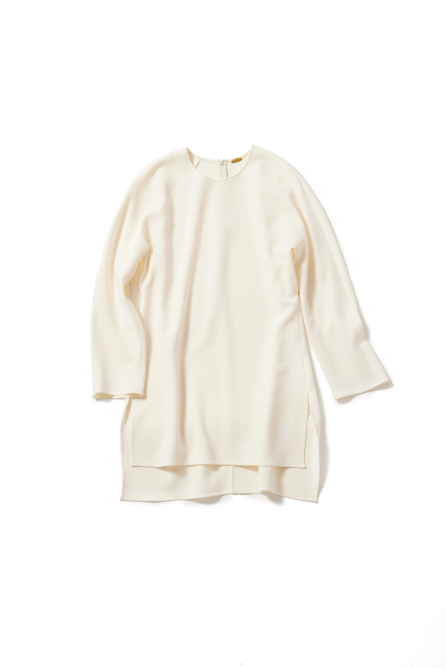 シンプルだからこそ、フォルムの美しさが際立つブラウス。身体のラインを拾いにくい立体的なシルエットに、縦のラインを意識した丈感、サイドの深いスリットと前後差のある裾が加わり、いつもの着こなしを新鮮なバランスへと導いてくれます。なめらかさの中にほどよいハリを感じる素材感で、白でも甘くなりすぎず、端正な印象に。