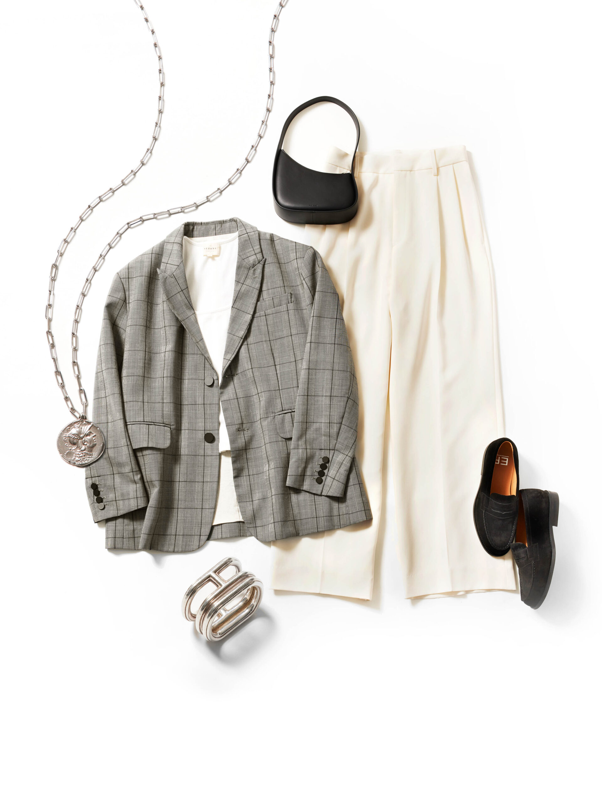 「ジャケット×ワイドパンツという、きれいめな組み合わせ。きちんと見える分、どこで力を抜くかが着こなしのポイントに。インナーには、デコルテがほどよく開いたスクエアカットのタンクトップを選び、肌の分量で抜け感をプラス。黒のバッグとローファーで輪郭を引き締めつつ、シルバージュエリーで軽やかなアクセントを添えました」