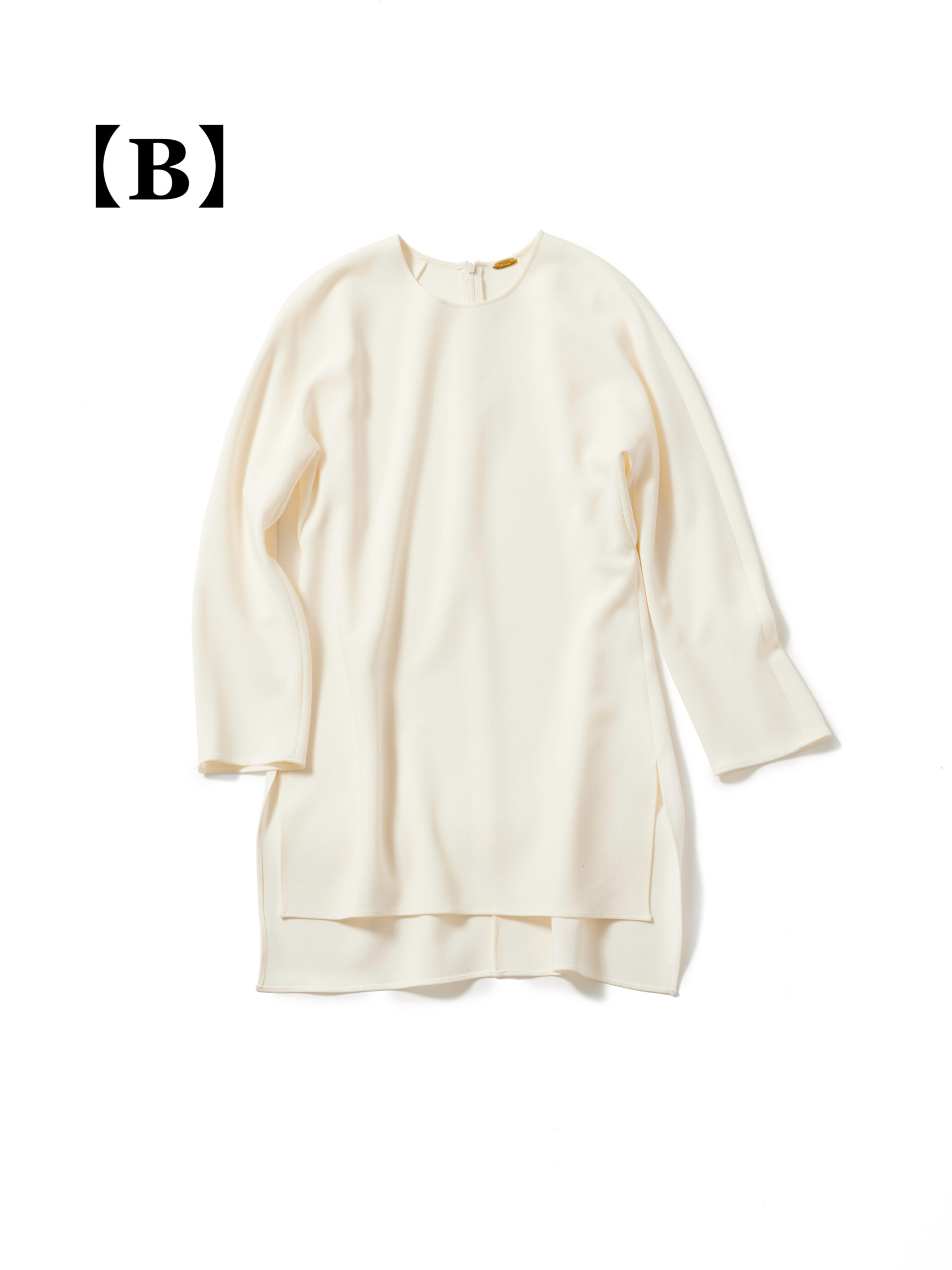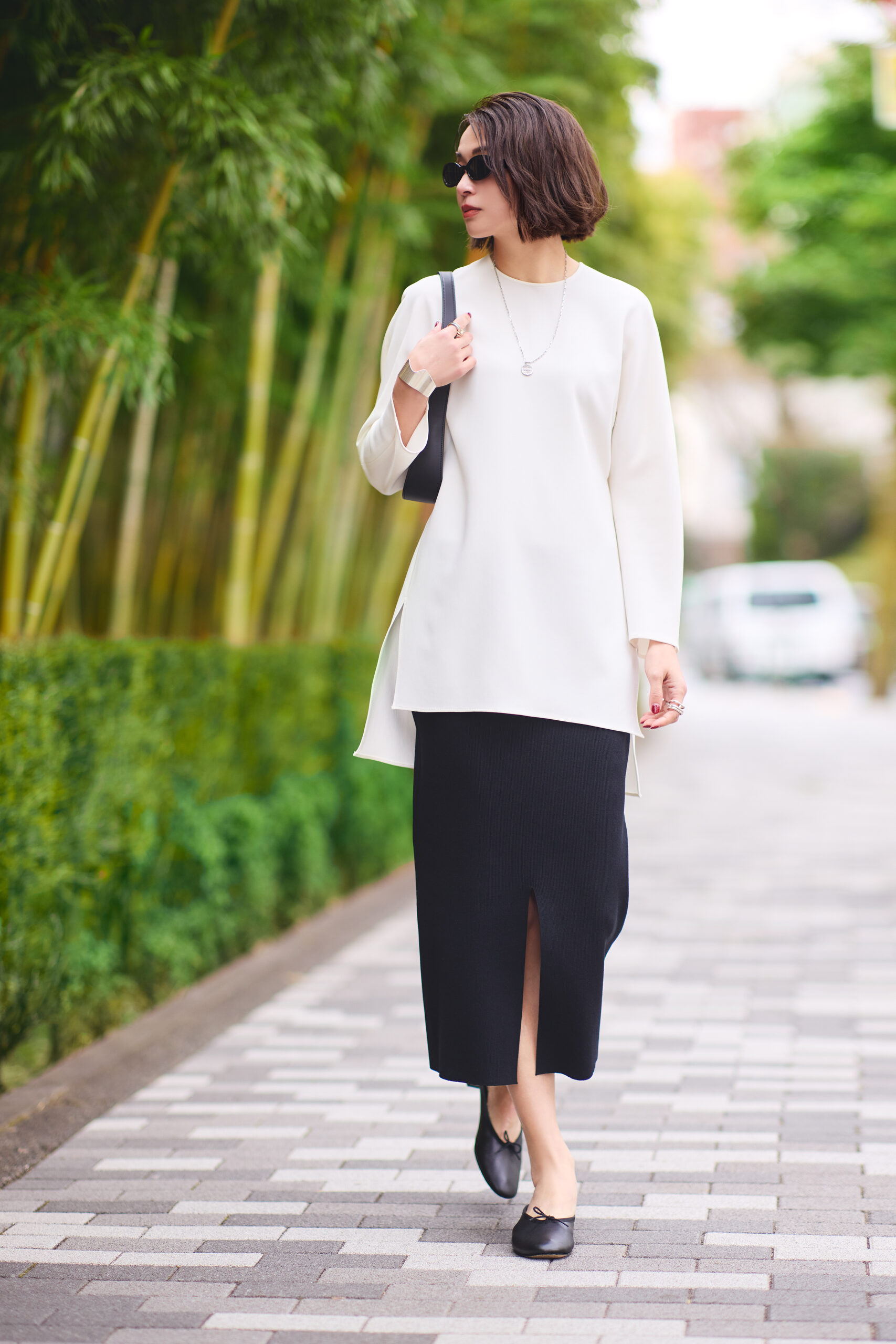 「白と黒だけで作った、潔いモノトーンスタイル。新鮮に見える鍵は、丈感とスリットがつくるバランスの妙にあります。チュニック丈の白のブラウスが縦のラインを強調し、黒のタイトスカートがその流れを汲んで、全体をすっきり引き締める。さらに、トップスのサイドとスカートのフロントに入ったスリットが動きを添え、軽やかな印象に。色を足さず、飾りすぎず。引き算しながら、丈バランスとディテールで今の気分を表現しました」