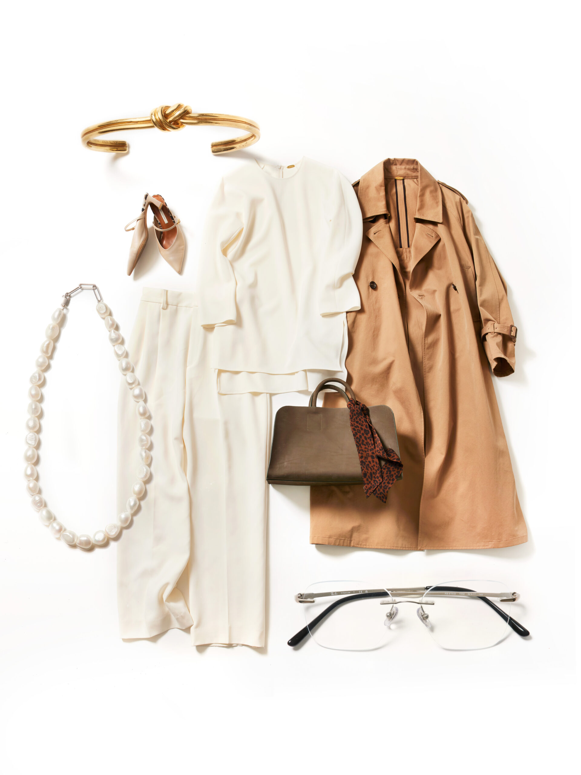 「今月のキーアイテムとして選んだ、白のブラウスとパンツは同素材。セットで着れば、ハレの日にも対応できるきちんと感があります。ただ、今回は、その端正さを活かしつつ、アースカラーのバッグやシューズを合わせることで、ほどよく肩の力が抜けた”日常”の着こなしに寄せました。仕上げにベージュのトレンチコートを羽織ることで、オールホワイトが持つ華やかさをトーンダウンし、落ち着いた印象に」