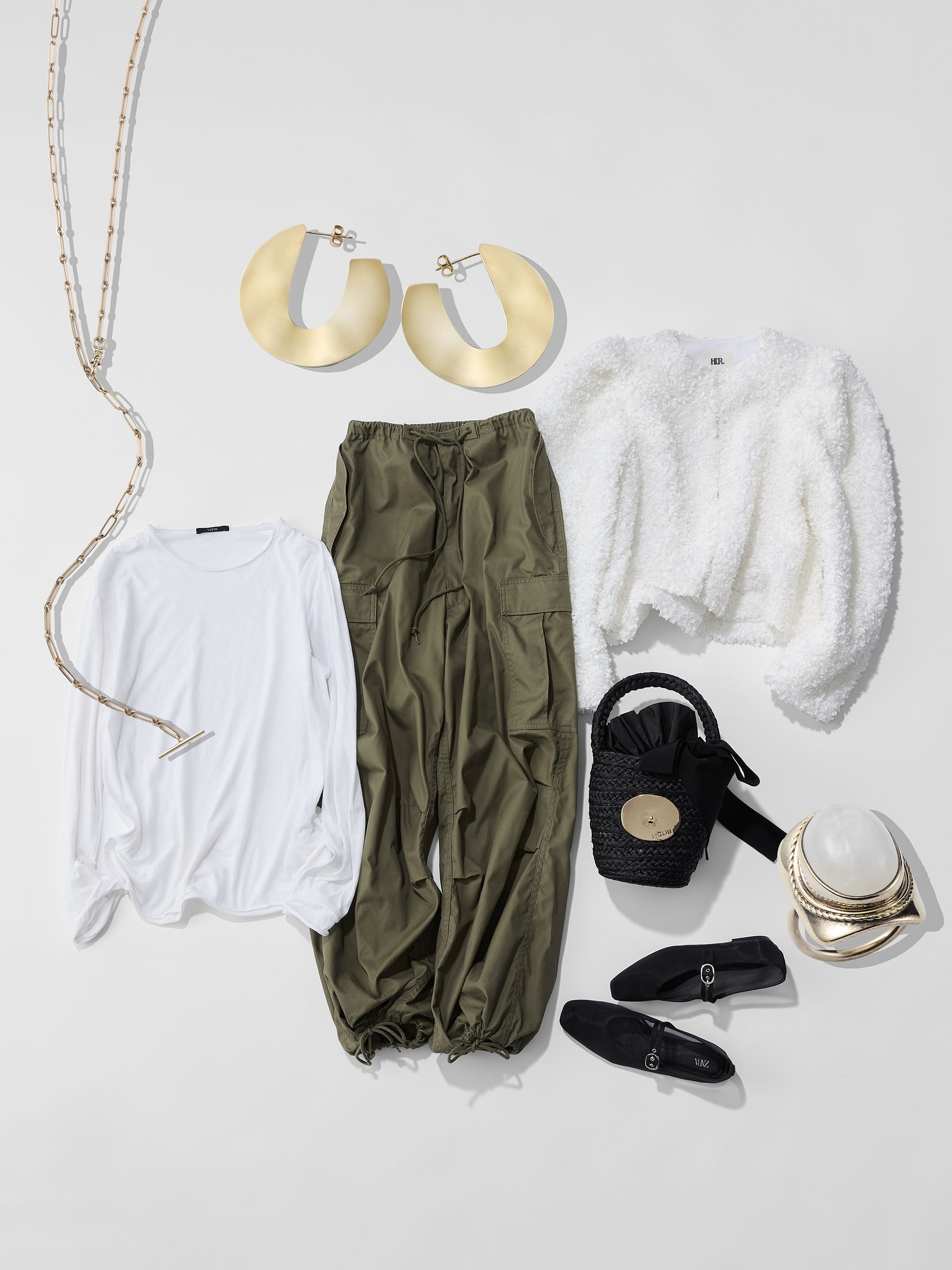「甘やかな白のジャケットは、ベクトルの異なるカーゴパンツでラフさをプラス。あえてテイストを揃えないことで、甘さが中和されるだけでなく、着こなしに”らしさ”が生まれます。かごバッグやバレエシューズを添えれば、フレンチシックなムードに。ネックレスはY字になるように留め、ピアスやリングも個性が光るものを。そんなジュエリーのレイヤードもパリっぽさを後押ししてくれます」