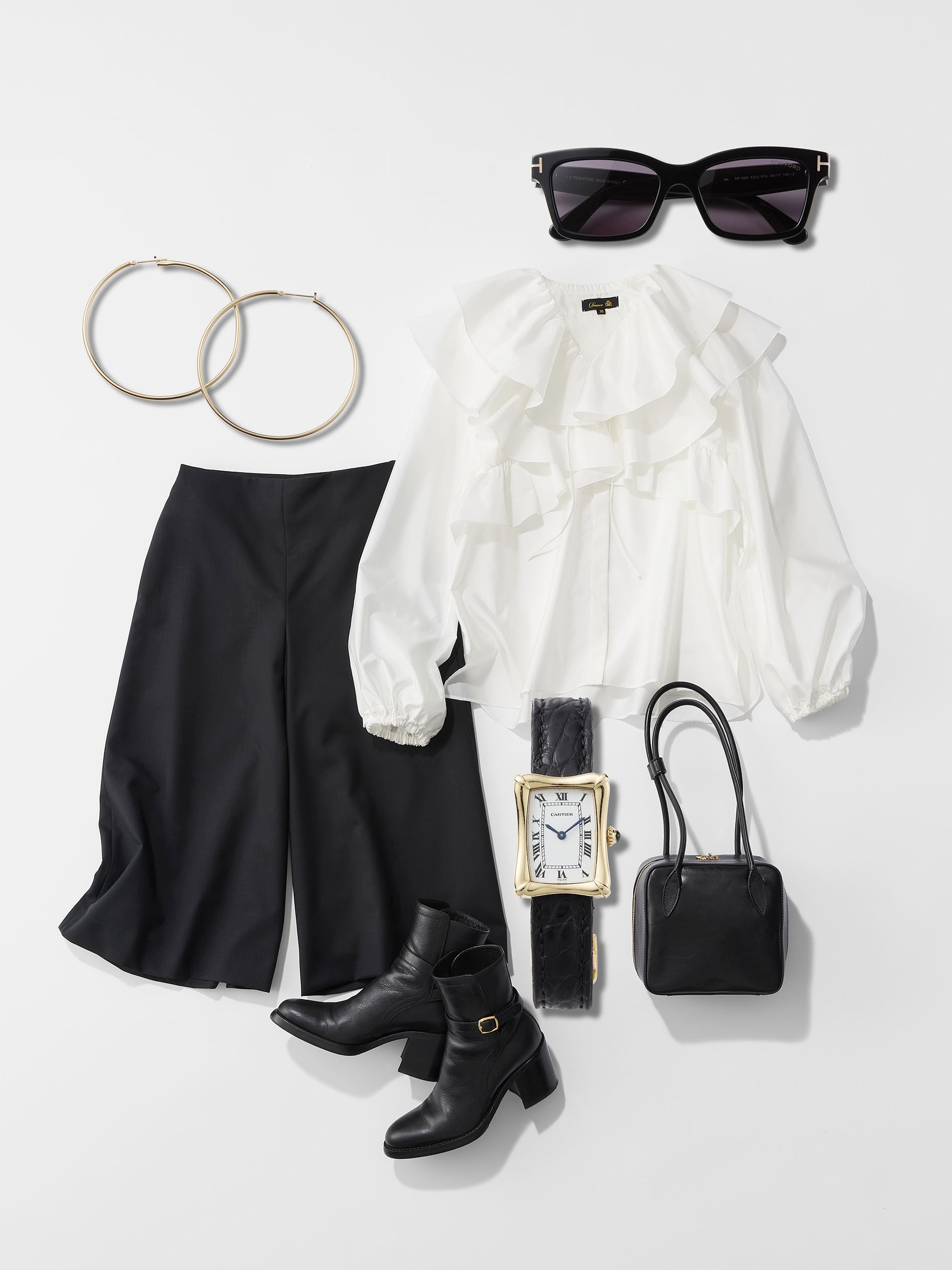 「顔まわりに華やぎを添える、大きなフリルが印象的なブラウス。この日はブラウス以外を黒でまとめ、スイートモードに昇華。ボトムスはハーフパンツ、足元はブーツで繋いで。フルレングスとは異なる重心バランスとわずかに肌がのぞく軽さが、スタイルにキレ味をプラス。華やかさと強さ、その両方を感じさせる着こなしです」
