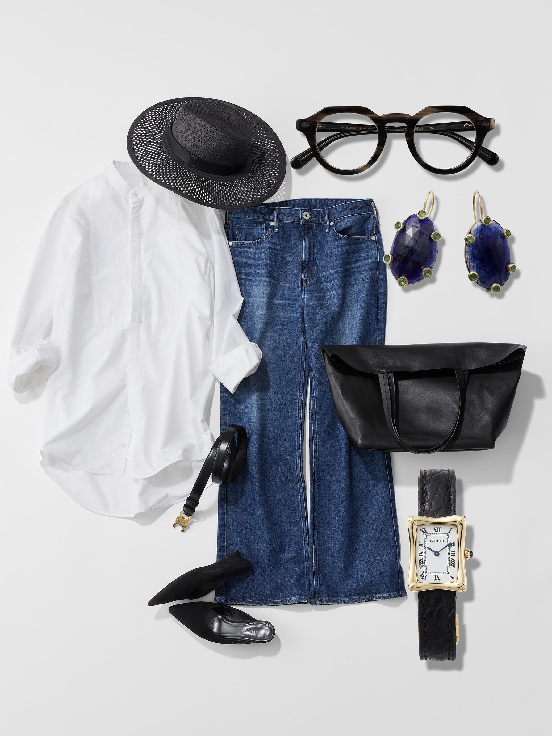 「白シャツにデニムというベーシックな組み合わせも、バランス次第で今の印象に。シャツはやや長めの丈感を活かし、下のボタンを多めに開けてベルトをさりげなくのぞかせて。リムが太めのメガネとレザーのバッグで知的なニュアンスを添え、ハットで視線を引き上げ、着こなしに抑揚を。王道をそのまま着ない、そのひと手間が印象を更新する鍵」