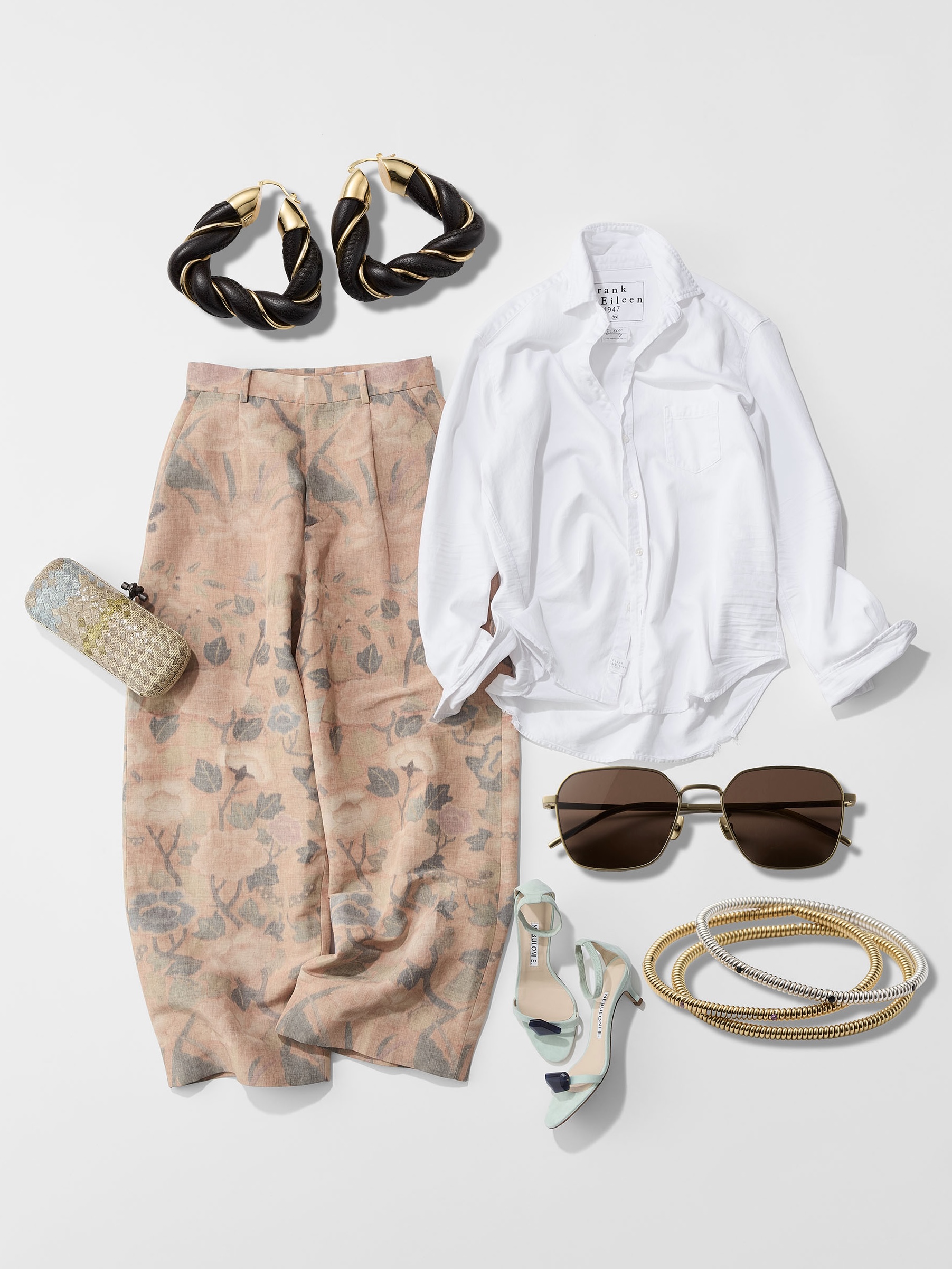 「あらかじめ施されたシワ加工が抜けを生む〈フランク&アイリーン〉のデニムシャツ。そんなシャツを軸に、柄パンツで華やかさとモード感をプラスしました。足元はパンツとトーンを揃えたミントのサンダルで、クリーンな抜けを。上半身がシンプルな分、ピアスはボリュームのあるものを選び、視線を引き上げてメリハリのある着こなしに。アペリティーボやレセプションでも“映える”スタイルです」
