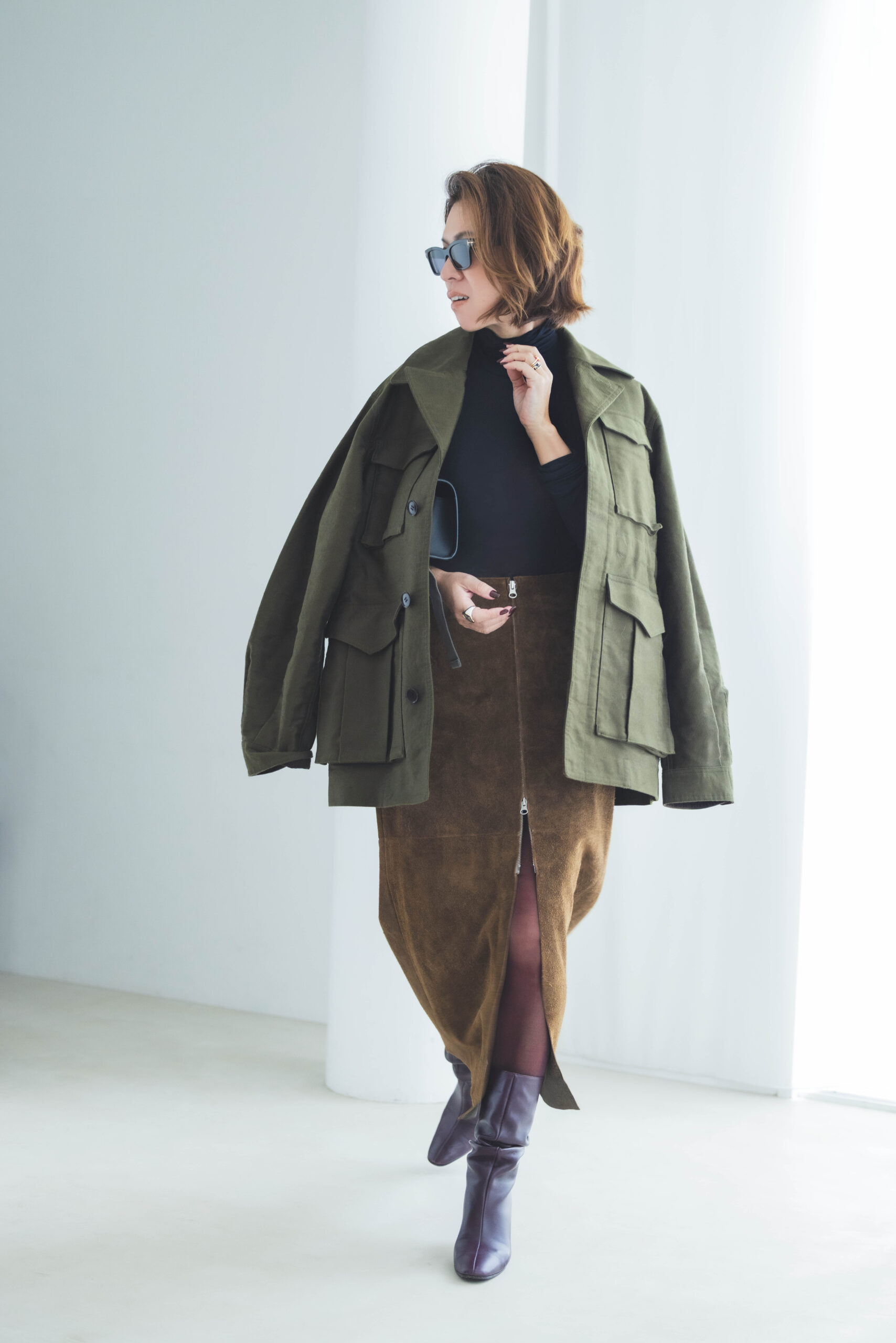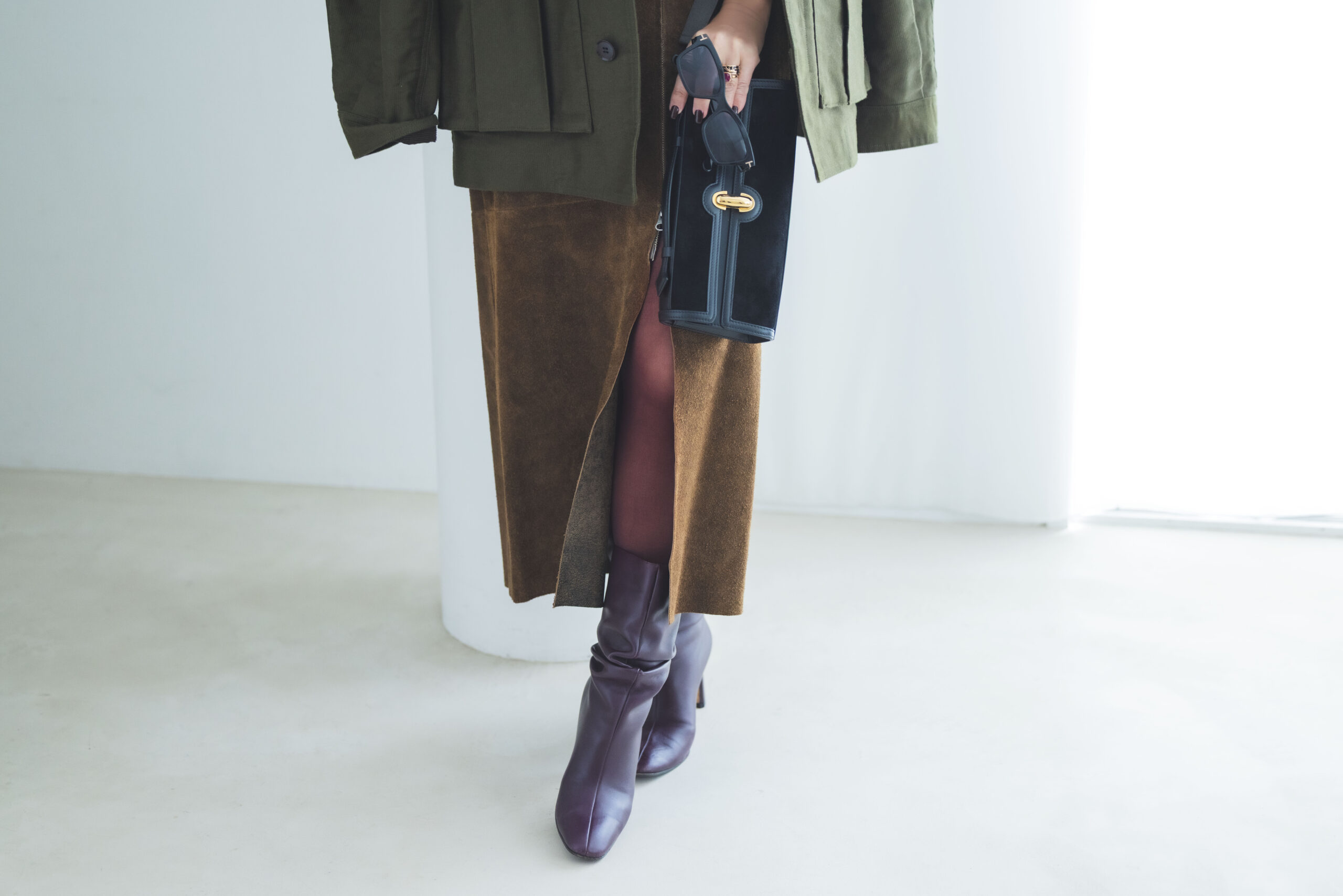 「カーキのミリタリージャケットに、スエードのタイトスカート。こんな辛口スタイルに合わせたのは、25デニールの“プラムブラウン”。私にとってレッグウェアはボトムスの一部で、ここにブラックやブラウンのタイツを合わせると、辛さが強すぎてしまう。だからこそ、リップでくちびるに血色を添えるように、赤みを帯びたタイツをセレクトして、艶っぽさや女性らしさを香らせました。さらに、“25デニール”という薄さを選んだのも、特筆すべき点。重い素材のボトムスにはデニールの低いタイツを合わせて肌の透け感を出すと、全体のバランスが軽やかに整います。ブーツとタイツの色をリンクさせれば、脚長効果にも」