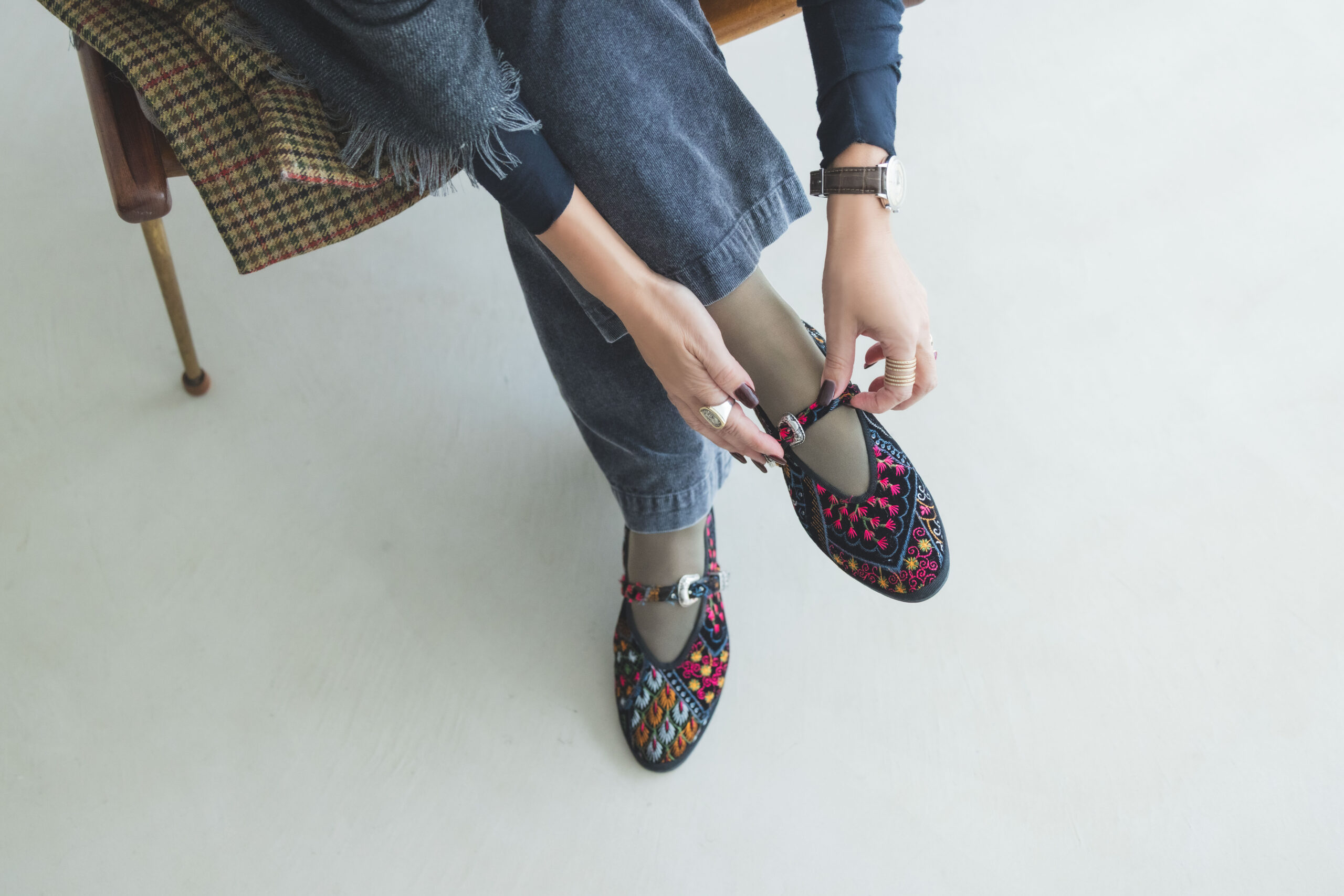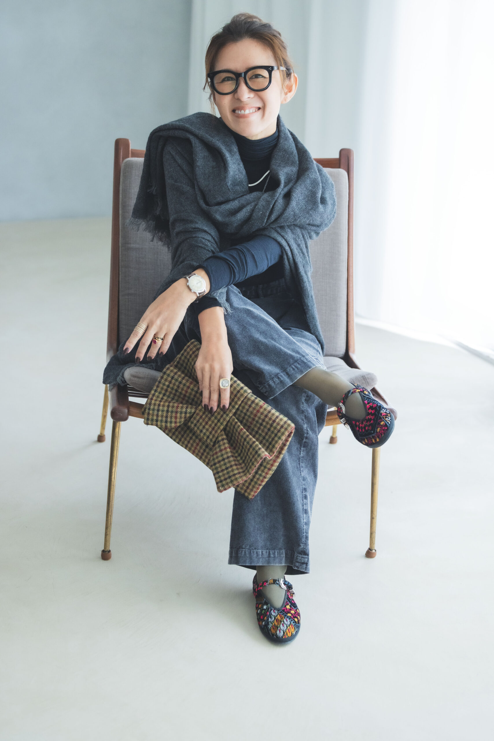 「シンプルなスタイリングのときこそ取り入れたいと思っているのが“ちょとした違和感”。すべてをきれいになじませるだけではなく、ときには一部分だけトーンをずらすことで、自分らしさや新鮮さを感じるコーディネートが生まれます。今回は足もと――手刺繍が施されたカラフルなシューズと、“ダークカーキ”のカラータイツでその違和感を表現。このダークカーキは、カーキだけれどグリーン味の強いグレーのようにも見えるので、コンクリートグレーと同じ感覚で取り入れることができ、カラータイツに抵抗がある人にもおすすめです。タイツの分量が多いとなかなかトライしにくいけれど、例えばパンツを合わせて、足を組んだときや階段の上り下りでさりげなくその気配を感じさせるだけでもいいんです」