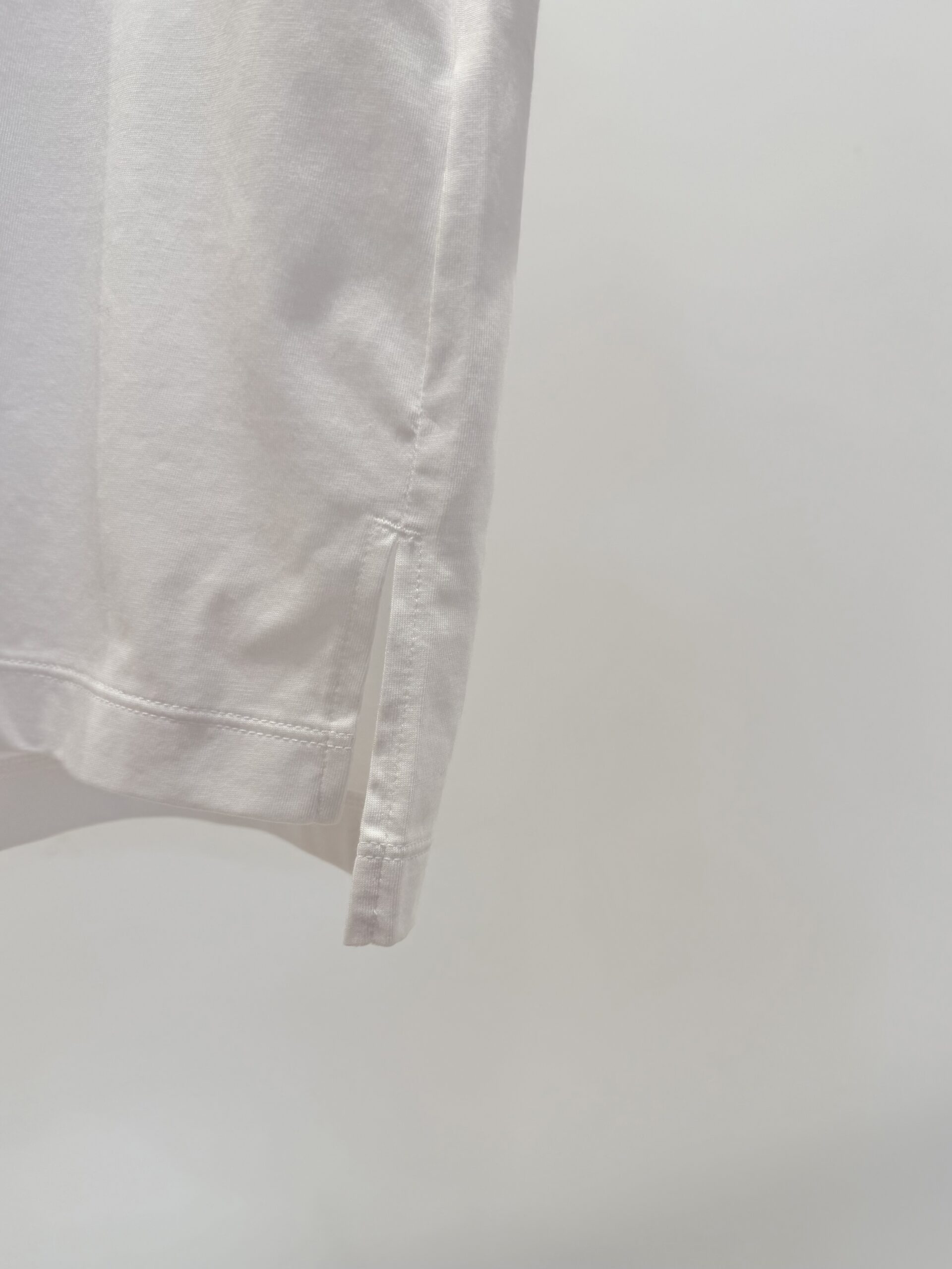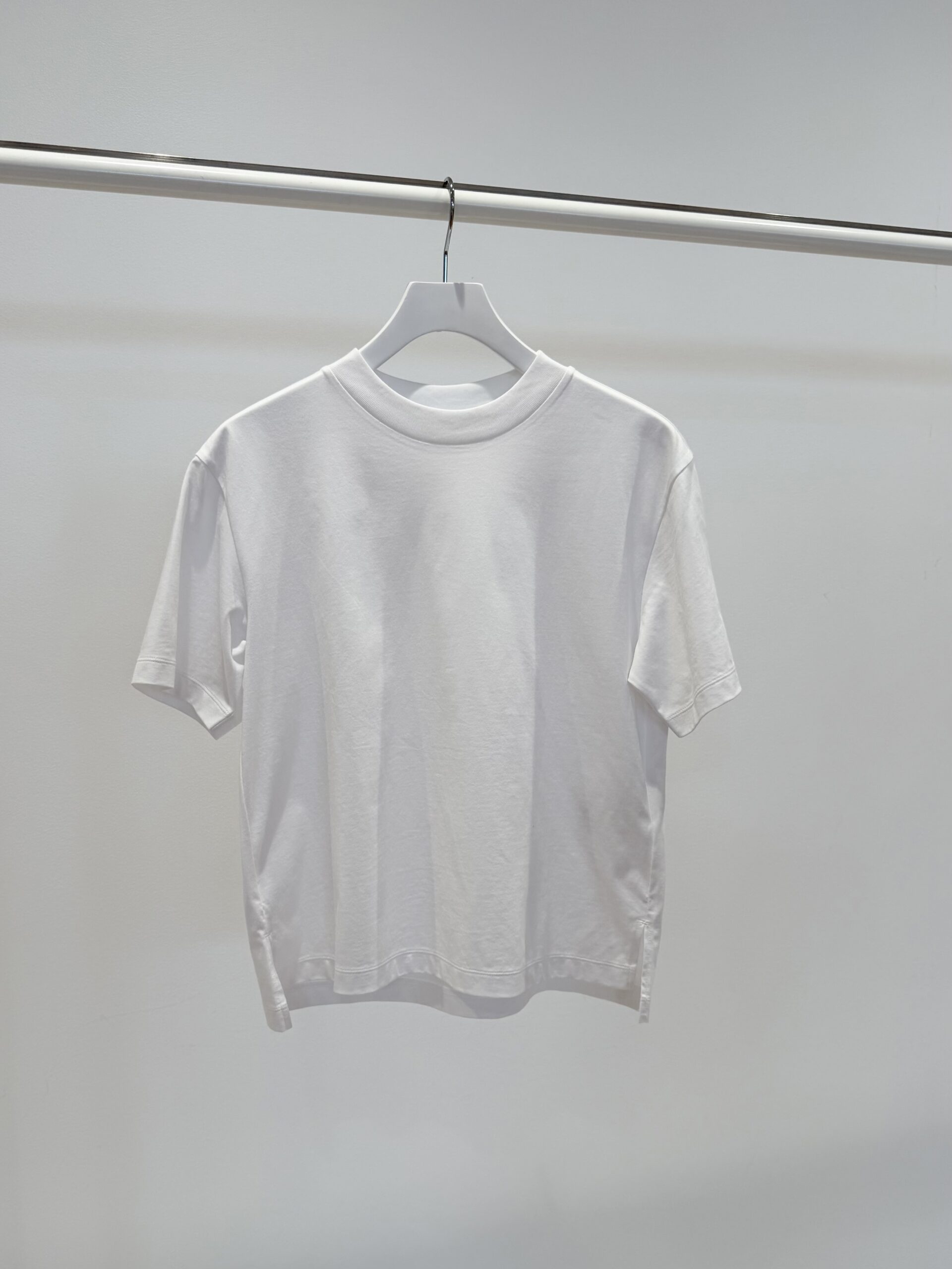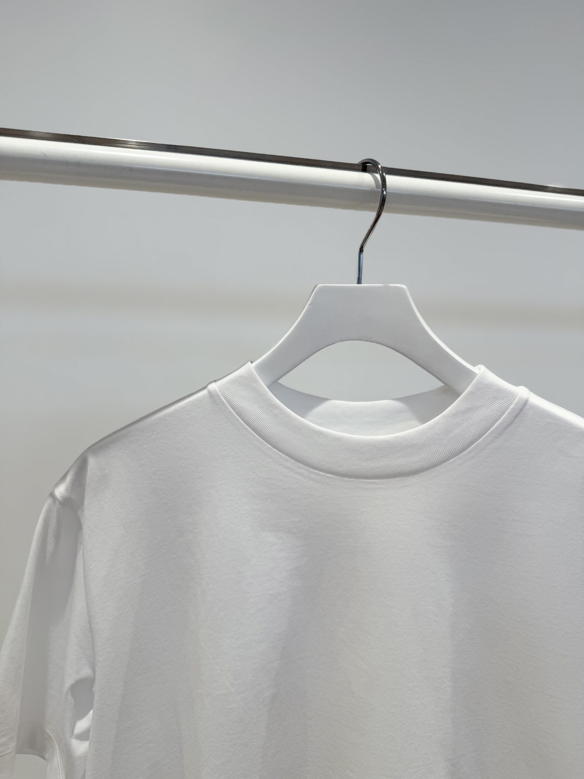「こちらの”白T”。まずいいなと思ったのが、襟のリブ。しっかりしているのと、あとはこの太さ。首の凹凸に沿ってくれて、キリッとしたクリーンな存在感があります。ここが頼りないと、一気に裸着感が出てしまうのですが、その心配がないのが魅力。