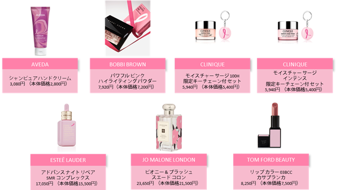 10月1日(水)より、アヴェダ、ボビイ ブラウン、クリニーク、エスティ ローダー、ジョー マローン ロンドン、トム フォード ビューティによる限定製品の販売をはじめ、収益金の一部が支援につながるキャンペーンを展開します。収益の一部は、米国乳がん研究基金(BCRF)やJBCRG (Japan Breast Cancer Research Group) 等を通して医療研究に役立てられます。