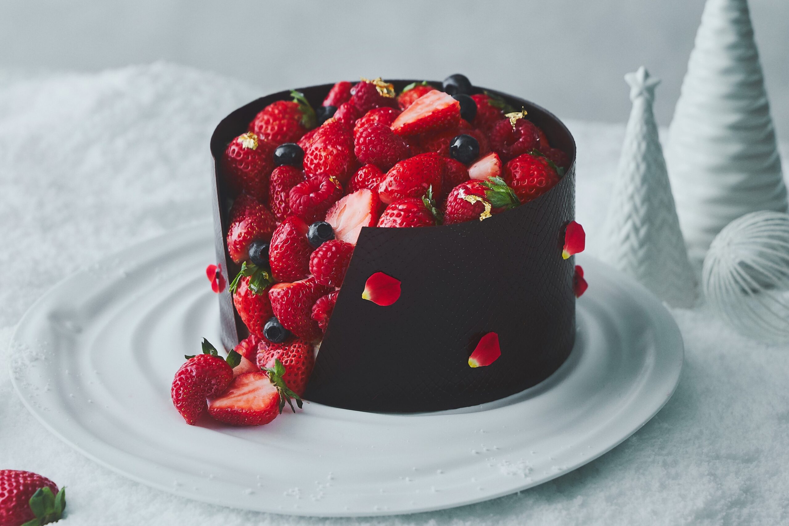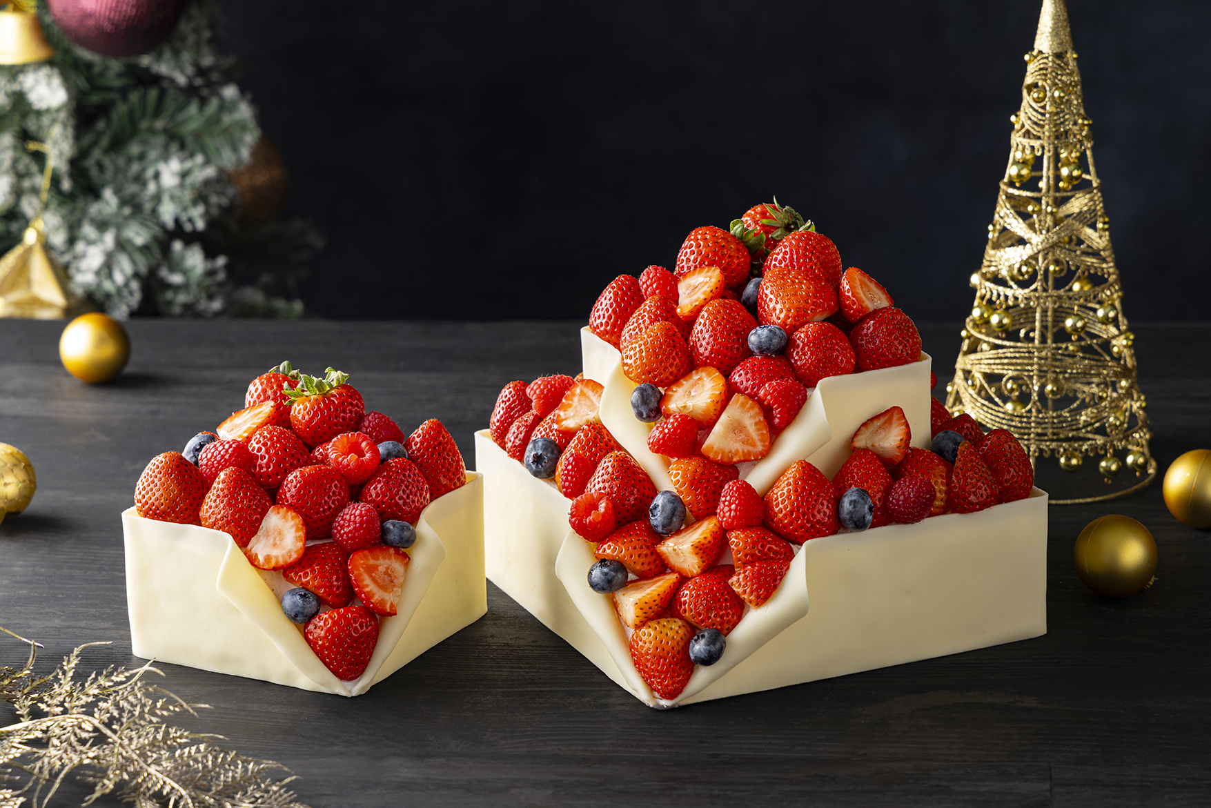 ベリーあふれるギフトボックスをイメージした、コンラッド東京のシグネチャーケーキ。きめ細かくしっとり焼き上げたスポンジに上品な甘さのホイップクリームといちごをサンドし、トップには国産いちごやラズベリーがふんだんにあしらわれています。華やかな見た目とは対照的に軽く繊細な味わいが魅力の、エレガントで洗練されたクリスマススイーツです。