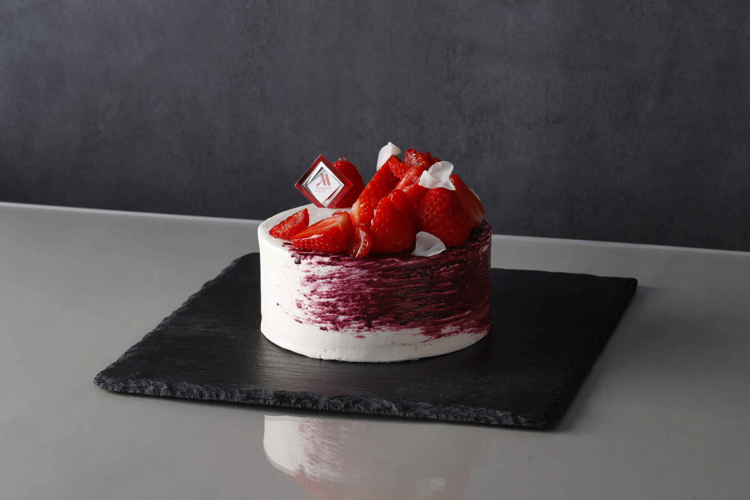 王道のショートケーキを極限まで昇華させた、ホテルのシグネチャーケーキ。国産いちごを中心に、数種のベリーをあふれんばかりに宝石のごとく飾り、金箔をあしらったエレガントなフォルム。豊かなコクがありながらも、すっきりとした後味の北海道産生クリームとしっとりとしたスポンジが主役のいちごの魅力を引き立てます。
