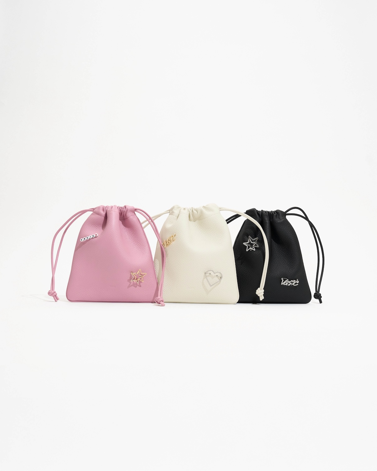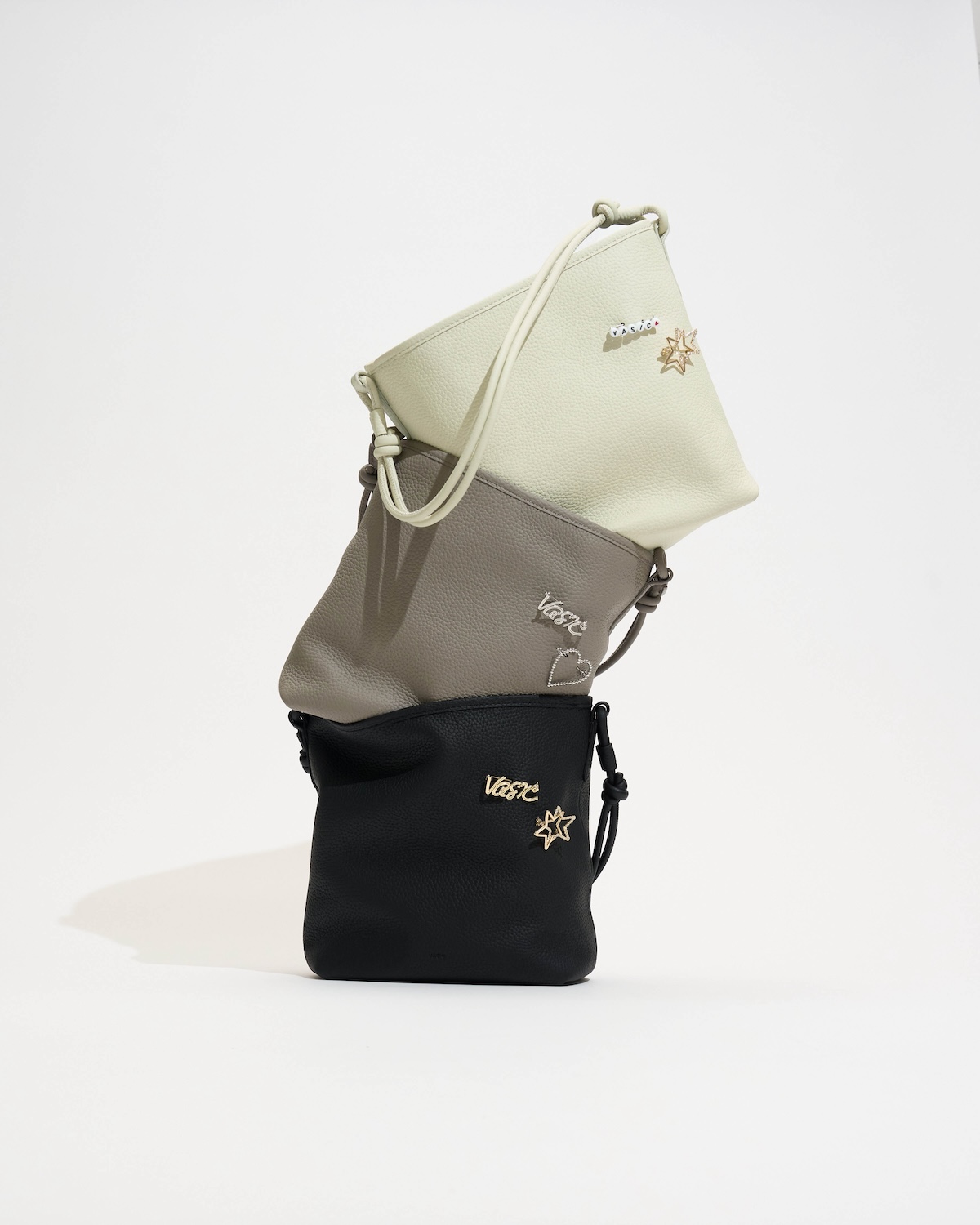 VASICのホリデーコレクションのバッグには、ブローチをつけるための穴が設けられています。アーカイブレザーでエシカルに作られた巾着バッグ「Tye(タイ)」とトートバッグ「Tome(トーム)」には穴が2箇所。「Bond Mini(ボンド ミニ)」は2箇所と4箇所の2バージョン、「Anyway(エニウェイ)」には1箇所の穴があり、それぞれの穴にブローチを通せるデザインになっています。VASICのオリジナルブローチはもちろんのこと、お手持ちのブローチと組み合わせて、バッグを自在にデコレーションすることできます。