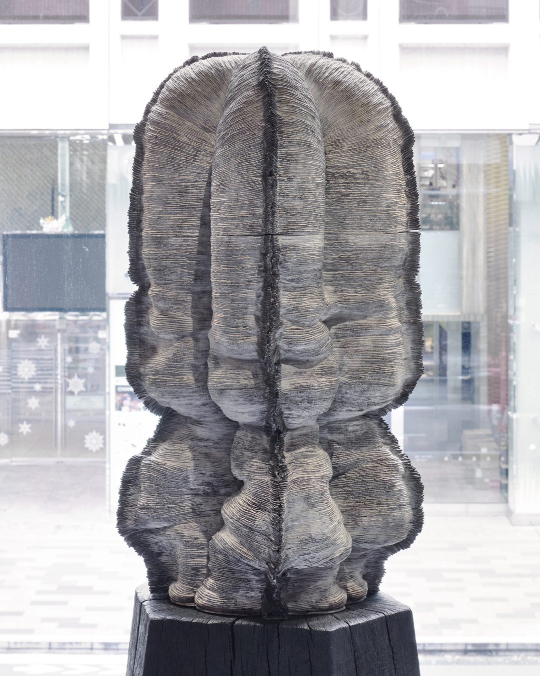 外壁は職人の手仕事で制作された、独特なマディグリーンのセラミックタイル。釉薬の不規則な表情とわずかな窪みが色彩に変化を生み、光を反射します。この深みのあるマディグリーンは、かつて江戸前島の先端にひろがる低湿地帯であった銀座の過去をも呼び覚まします。