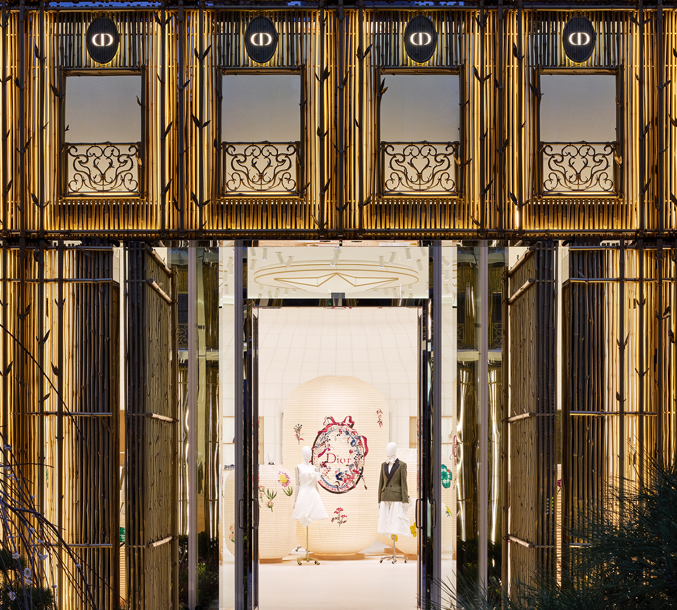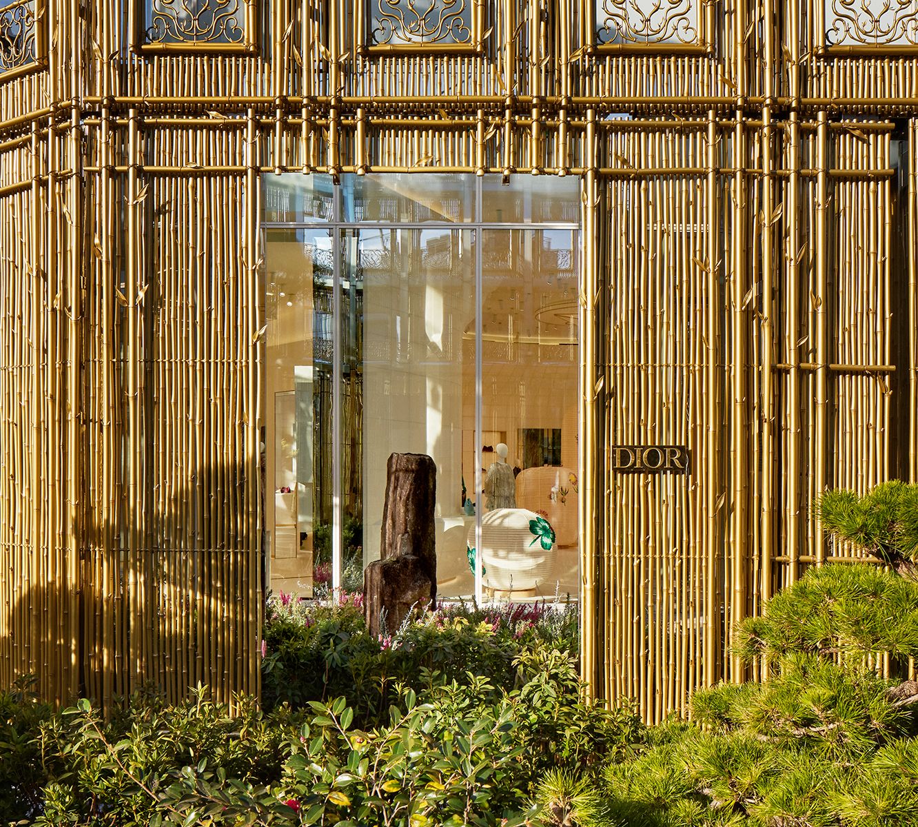 「ディオール バンブー パビリオン」は、日本の竹林に着想を得ており、パリ本店「30 モンテーニュ」のファサードをゴールドに染め上げた竹で再解釈されました。夜にはライトアップされ、訪れる時間によってその表情をガラリと変えるものとなっています。敷地面積1,800平方メートル超という圧倒的なスケールも、ディオールと日本との揺るぎない絆を象徴すると言っても過言ではありません。