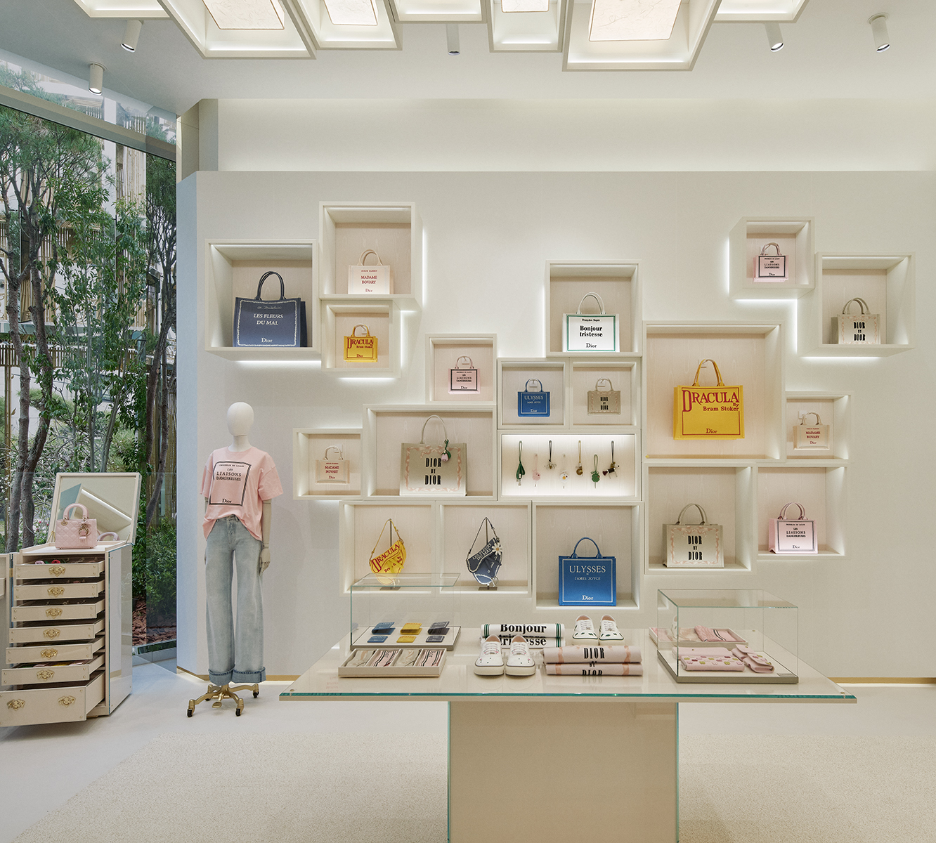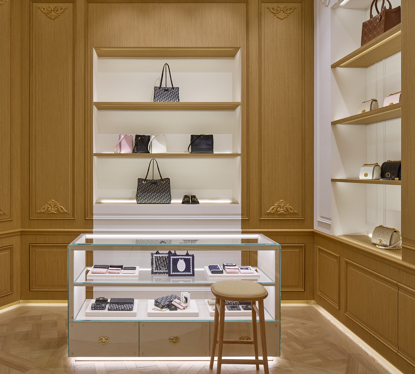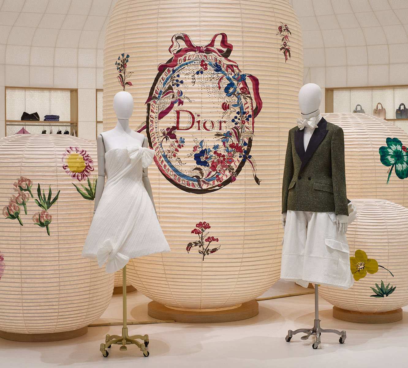 ブティック内は、スターやヴェルサイユ様式の寄木細工のフローリングといったディオールのコードが、日本の職人技とともに輝きを放ちます。天井や壁の仕上げには、和紙が詩情豊かにあしらわれ、豪華に施されたエンボス加工が象徴的なパリのモールディングを思わせます。館内のグリーン演出は、ディオールとのコラボレーションでも知られるフラワーアーティスト・東信氏が担当。創設者であり、クチュリエでもあるクリスチャン・ディオールの花々への情熱に捧げる新たなオマージュとして、花をカプセル化。その本質を捉え、その美しさを永遠のものとする植物標本を創り出しました。