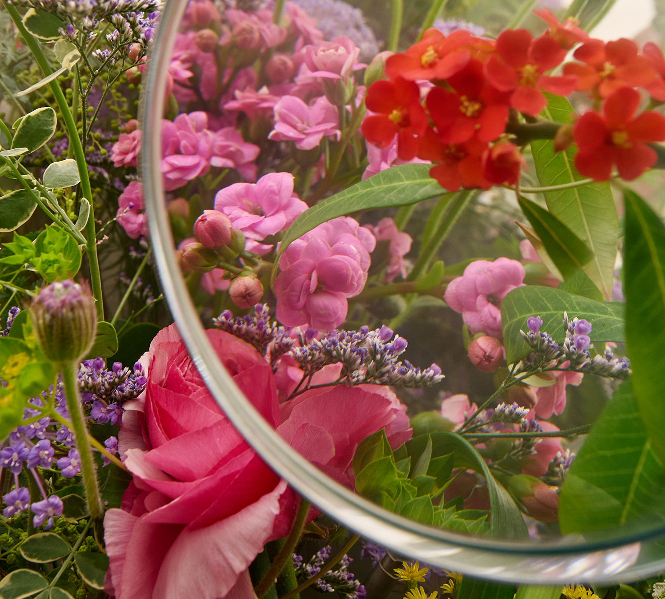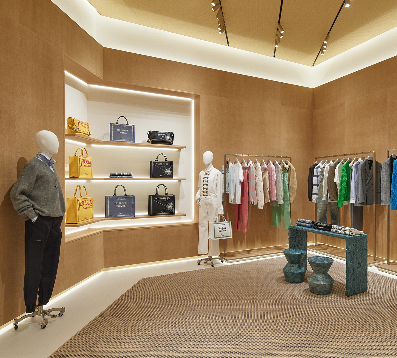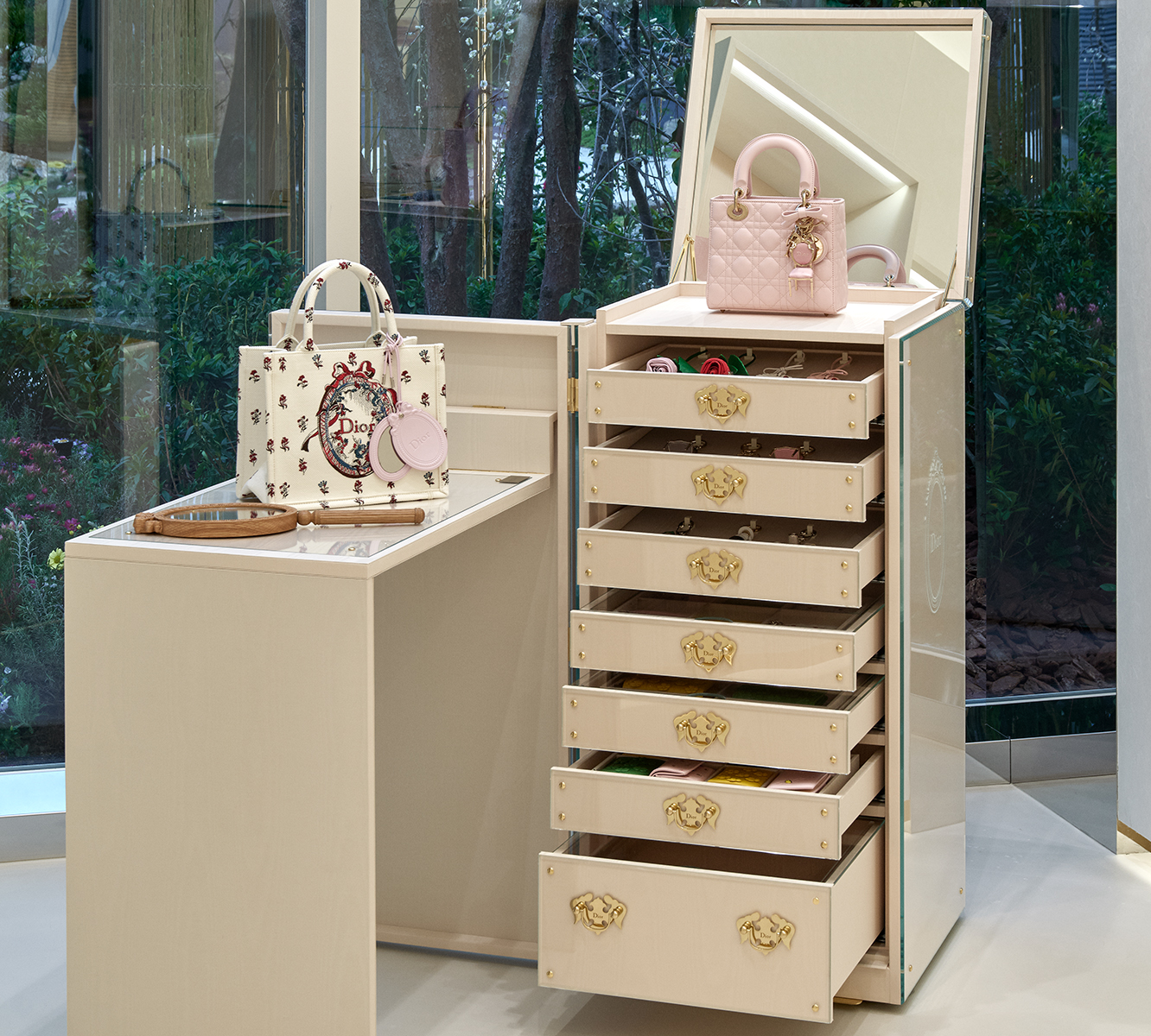 ブティック内は、スターやヴェルサイユ様式の寄木細工のフローリングといったディオールのコードが、日本の職人技とともに輝きを放ちます。天井や壁の仕上げには、和紙が詩情豊かにあしらわれ、豪華に施されたエンボス加工が象徴的なパリのモールディングを思わせます。館内のグリーン演出は、ディオールとのコラボレーションでも知られるフラワーアーティスト・東信氏が担当。創設者であり、クチュリエでもあるクリスチャン・ディオールの花々への情熱に捧げる新たなオマージュとして、花をカプセル化。その本質を捉え、その美しさを永遠のものとする植物標本を創り出しました。
