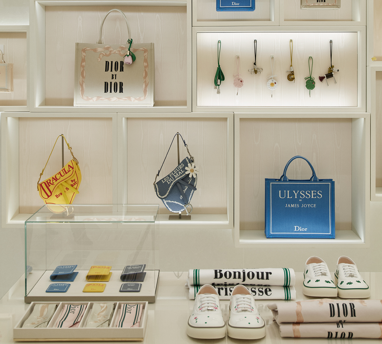 入り口を入ってすぐ左にある部屋には壁一面に新作の「ディオール ブックトート」がディスプレイ。バッグに取り付けられるチャームやスカーフも揃うので、カスタマイズすることも楽しめます。
