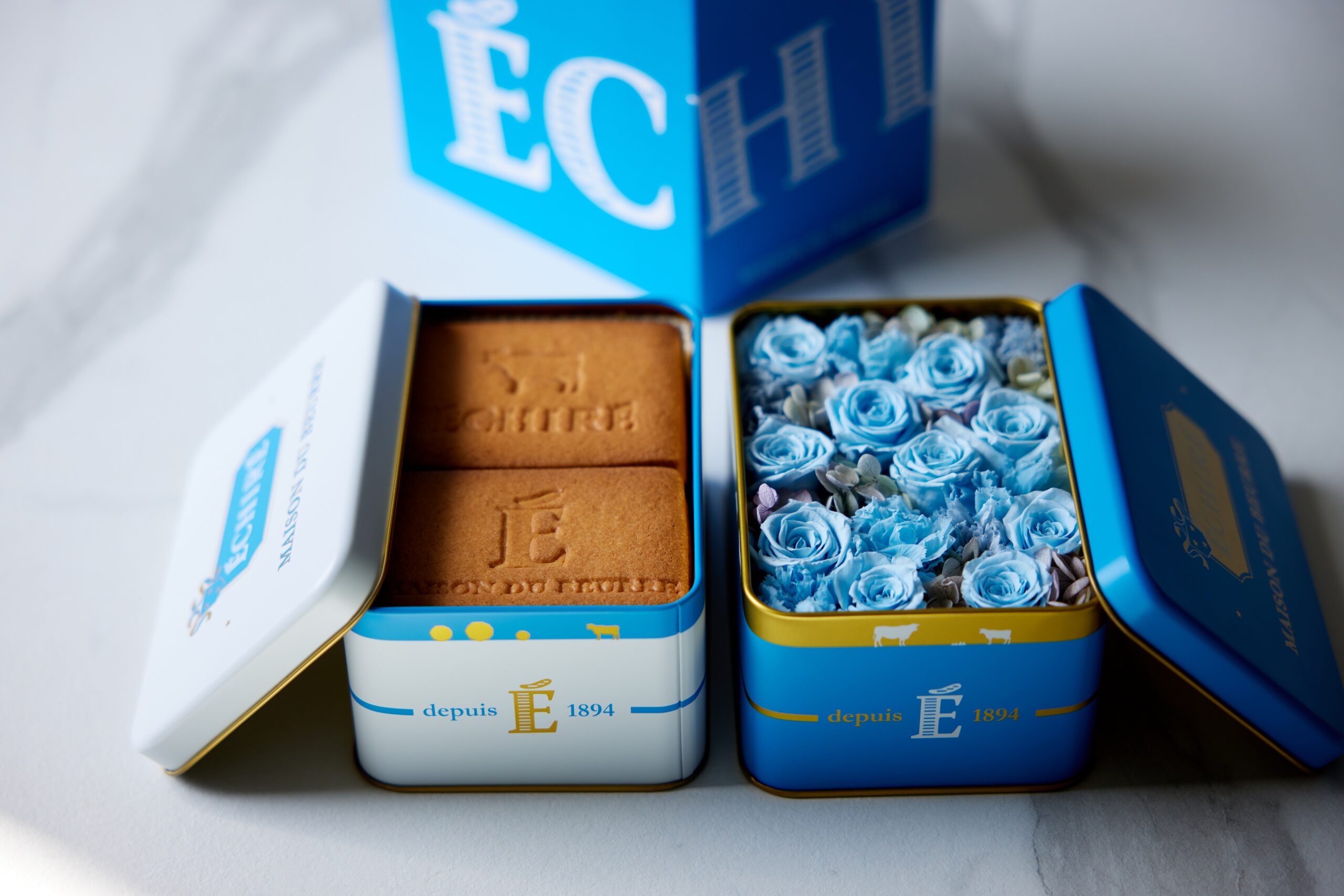 美しい花と焼菓子がつなぐ感謝の想い。ともに丸の内に店舗を構える「エシレ・メゾン デュ ブール」と「HANAHIRO CQ 丸の内店」が、母の日ギフトとして、限定仕様のセットを手掛けました。エシレを象徴するブルー缶とホワイト缶の2缶構成で、ブルー缶には、青いバラを基調とするHanahiroのプリザーブドフラワーを丁寧にしつらえました。